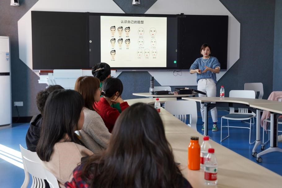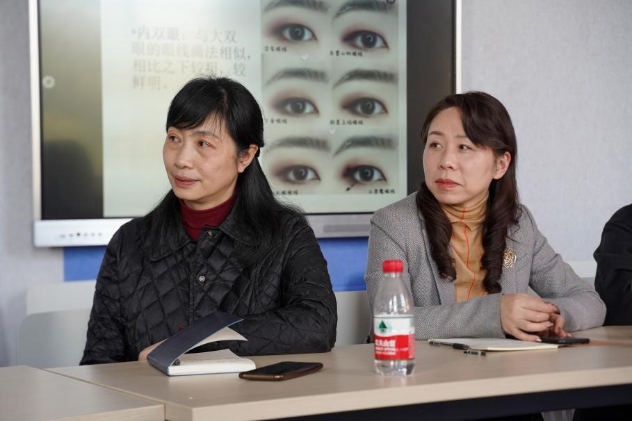 刘彬阳将讲座分为理论讲述与实践操作两个部分。在理论讲述环节中,刘彬阳首先梳理了化妆的基本流程,强调了各个步骤的作用与重要性;其次,针对不同的脸型、眼型、眉型、嘴型,刘彬阳讲授了不同的上妆方法,并为现场女教师提出妆容的改造建议;最后,依照色彩的搭配法则,刘彬阳结合实例畅谈穿衣的多种风格。理论讲述结束后,刘彬阳为教师代表进行了妆容、衣着方面的设计与改造。在场女教师通过近距离观察上妆过程,结合刘彬阳的讲解与答疑,更好地理解了理论内容。改造的成果得到了在场女教师的高度认可。