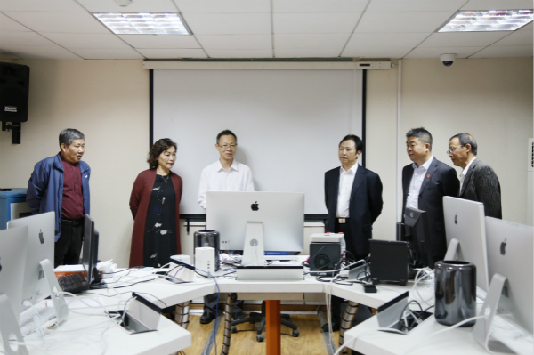 公司党委书记银海强向魏文彬一行介绍了公司近年来在团队建设、人才引进、本科教育、部校共建等方面取得的成绩,并陪同参观了媒介创意工作坊、新媒体苹果机房、致远传媒网络文化工作室和视觉传播与广告设计工作坊和新媒体校级重点实验室。