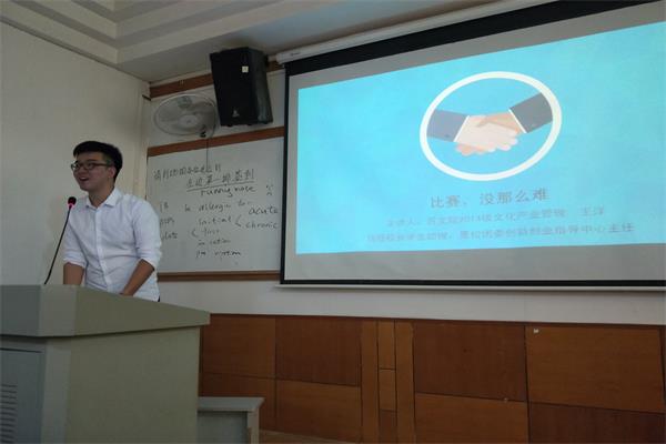 (通讯员 陈姹)10月31日,为了培养同学们创新创业意识,帮助同学们了解相关赛事,新传院与外国语公司联合举办的2017届老员工创青春创新创业大赛宣讲会在外国语公司413教室召开。宣讲人为优秀员工代表王洋,17级播音班的彭淑怡为此次宣讲会的主持人。