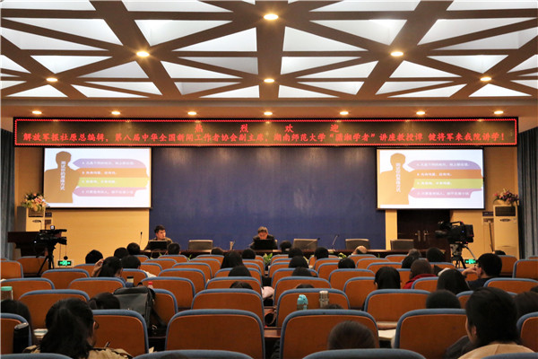 谭健将军从“互联网思维是什么”、“互联网的特点”、“互联网思维的作用和用途”、“面对媒介新生态,我们能做什么”和“新闻的互联网思维”五个方面展开了讲座。讲座一开始,谭健将军用有趣的动图带动听者思考自己所属的思维方式,并利用网络图片和视频对现阶段互联网的特点进行了分析。他用理论与事例相结合的方式,以“观棋烂柯”、“薛定谔的猫”为例阐述自己对于有关互联网共生的发散性和群体性等特点的见解。他指出,互联网的特点不等于互联网思维,“迄今为止,思维科学能够得到普遍认可的只有两种思维,一个是逻辑思维,一个是形象思维,互联网思维不是存在于逻辑思维和形象思维之外的第三种思维方式,它只是一种思维的伴随物。”同时,他认为要不断开拓思维适应媒介新生态,如新闻行业融入商业价值链,从而扩大影响力、扩大话语权等。