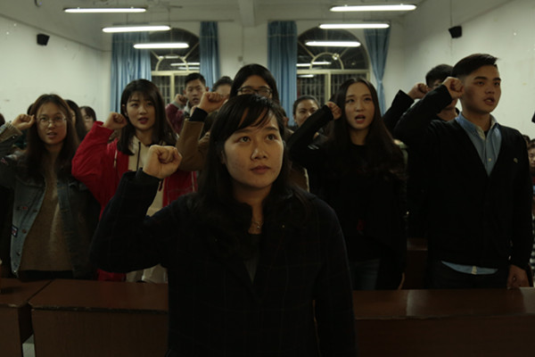 典礼在雄壮的国歌声中拉开帷幕。欧阳丹玲老师领誓,二十四名新党员在党旗下宣誓入党。