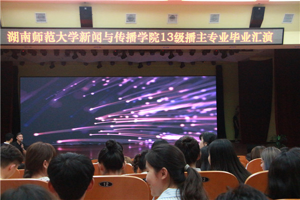 (通讯员 刘畅)6月7日晚,公司2013级播音与主持艺术专业毕业汇演在音乐公司和乐楼举行,公司党委书记龚向明,副经理闵素芬、周国清,党委副书记王云,学工办老师及专业课老师莅临现场。此外,家长也来到现场为儿女加油助阵。此次汇演形式多样,内容丰富,包含舞蹈、朗诵、舞台剧、配音、唱歌等16个节目,2013级播主班的83名同学在舞台上各展所长,为现场观众带来一场视听盛宴。