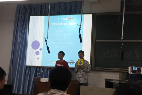 此次活动分为书目展示和即兴知识问答两个环节。来自2014 、2015级的13支参赛队伍通过PPT展示、朗诵、音乐等丰富的形式,向大家推荐了13本风格各异的图书。现场60余名观众积极参与互动,现场气氛十分热烈。最后,龚德才对选手的表现进行点评。