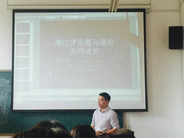 (通讯员 程艺雪)11月9日下午,潇湘晨报首席评论员高亚州在公司302教室,围绕“如何让常识撬动你的思想”的主题为2013级新闻班同学授课,为同学们分析“时评”的发展方向,并传授时评写作的方法。魏剑美副教授一同参与课堂教学。
