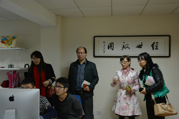 肖燕雄、闵素芬陪同贺卫国一行参观了公司的CATI室、网络传播工作坊、媒介创意工作坊、新媒体苹果机房等教学科研场地。恰逢2012级编导班正在新媒体苹果机房进行毕业展映的筹备,贺卫国饶有兴致地观看了同学们剪辑视频的过程,并对公司这类以员工为主的实践活动大加赞赏。王云副书记同欧阳书记就员工党建工作进行了交流。