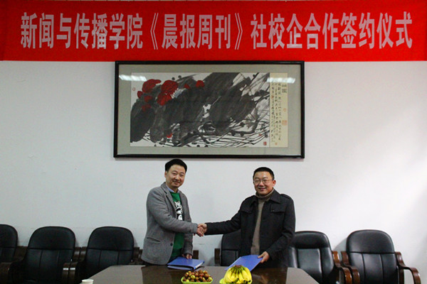 随后,方华社长与蔡骐经理正式签订了双方的校企合作协议。公司党委书记龚向明、《晨报周刊》副社长李凌芳、公司副经理闵素芬以及公司党委副书记彭露出席了签约仪式。