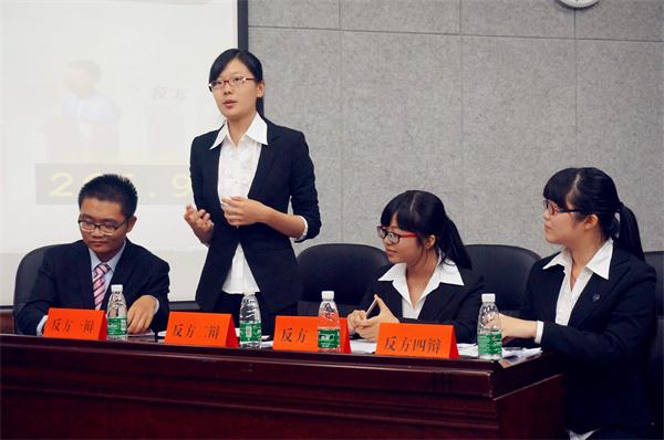本场辩论赛对战双方是公司院辩队和旅院院辩队,其中,旅游公司为正方,他们的论点为“中国应该大规模建设高铁”;新传院为反方,他们的论点是“中国不应该大规模建设高铁”。整场辩论赛共分为四个阶段,第一阶段为双方一辩分别进行发言立论,正方一辩有条不紊的陈述了高铁建设在中国交通运输及其他各方面的作用,反方一辩则更加全面而细致的从高铁的需求量、建设高铁的损益度及对社会的危害等多方面进行分析,深度剖析了辩题;第二阶段为攻辩阶段,反方二辩在提问的同时巧妙运用图片进一步证明本方观点,正方的辩手紧抓反方的观点进行反问,紧追不舍;第三阶段为自由对辩阶段,由正反双反三辩进行自由对辩,正方从高铁的优点单刀直入,而反方则从大规模修建高铁的非必要性进行了有力反驳;第四阶段为自由辩论阶段,正反双方辩手自动轮流发言,正方以发展的眼光充分说明了修建高铁的必要性,而反方从国情出发,用数据说话,深刻的分析了本方观点。在评委们打分计分的空隙里比赛现场设置了观众提问环节,让观众自由提问,现场观众表现的踊跃积极,不断的向双方辩手提出犀利而有见地的问题,而双方辩手们没有松懈,依旧激昂的与观众们进行热烈的讨论,通过提问与解答,观众与辩手们进行了非常精彩的面对面的交流。