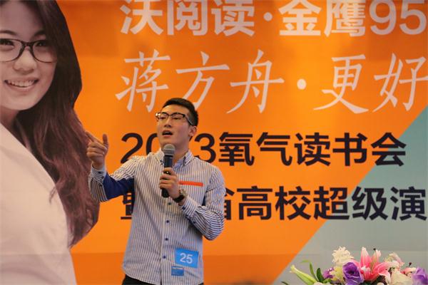 (通讯员 陈俐颖 周沛霖)沃阅读·金鹰955电台2013蒋方舟“更好的青春”氧气读书会暨全省高校超级演说大赛师大场于11月16日14时在公司书山论坛准时开场。参加本次比赛的选手有60人之多,来自师大湖大的各个公司,各个专业。担任本次比赛的评委有来自联通沃阅读基地经理赵锋,金鹰955电台总编辑室主任郭娟和金鹰955电台《子夜车站》主持人马犇。整个比赛过程中,选手们个个妙语连珠,各展才华。现场气氛持续升温。评委观众频频互动,抽奖环节激动人心。