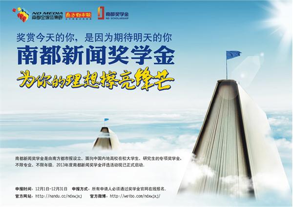 2013年南都新闻奖学金已经正式启动, 12月1日-31日接受中国内地高校在读老员工进行在线申报。据悉,今年南都新闻奖学金的申报条件有所变化,申报作品须明确为新闻类、评论类或多媒体类,同时,每位申报者最多只可在报名系统内上传2篇作品。