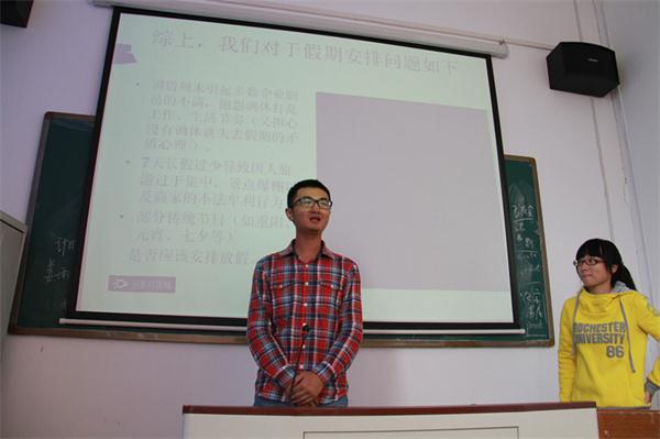 首先,主讲人陈云鹤通过一张张PPT的播放,结合视频中的专家们讲解,阐述当下节假日出现的一些现象,引发大家对黄金假期的思考。随后,讨论正式开始。评论员们针对目前节假日存在的种种问题,积极发言,提出自己的意见与建议。大家的发言都充满了个性,具有独特的建设性,让人感受到新世纪新青年的创新意识与朝阳般的活力。而评论员江青波同学以“高中恋爱是五一”、“大学恋爱是国庆”的形象比喻,阐述了他对7天长假过少而引发的旅游季爆棚现象的解释。将现场的气氛达到高潮。