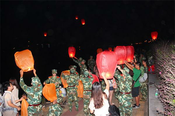 随后,张磊和新生代表一起在江边放飞象征希望和祝福的孔明灯。百灯齐放,烟花绚烂。每一位新生都在上面写下自己对家人朋友的祝福、大学的期待以及军训的感受。红色的孔明灯犹如漫天的星光,伴随着美丽的烟花缓缓升入夜空。