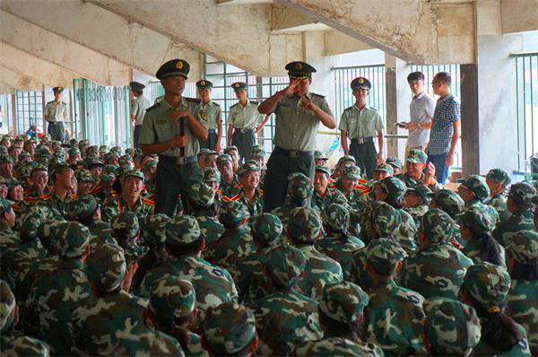 下午开始训练之后,各班教官将自己分管的班级带入风雨长廊。在教官们和新生进行短暂的交流之后,在2013级军训总教官蔡佳霖带领下,新传院2013级全体新生开始了和文公司新生的拉歌比赛。大家热情高涨,你来我往,风雨长廊里也爆出阵阵笑声,气氛一度被推向高潮。