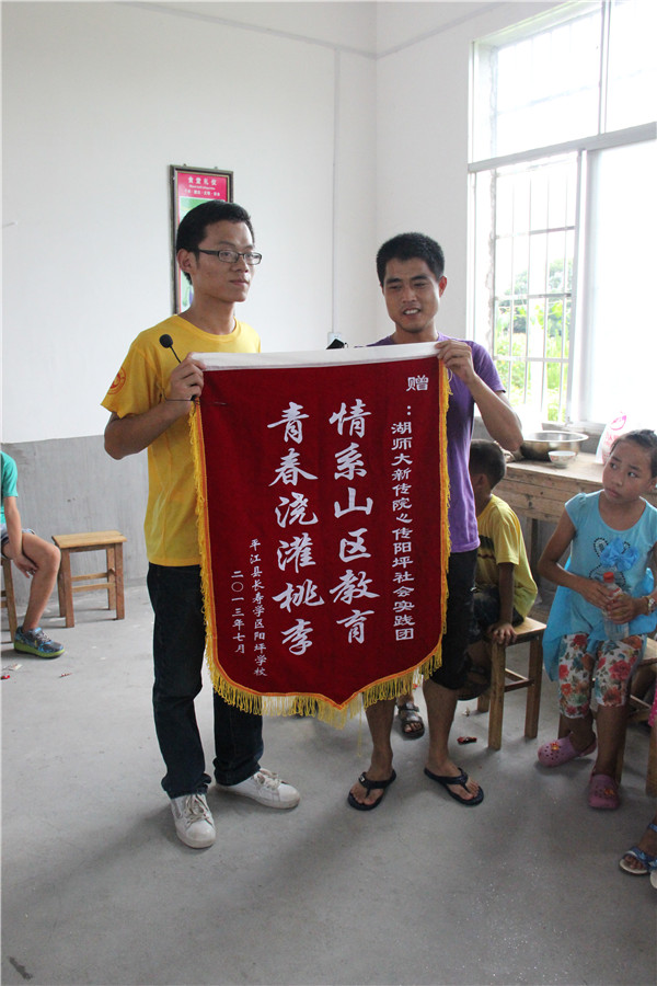 文艺汇演结束后,当支教团结束为期17天的支教调研之旅准备返回长沙之时,阳坪小学陈老师受阳坪小学董事长委托为三下乡团队颁发印有“情系山区教育 青春浇灌桃李”字样的锦旗,以表达对三下乡团队的肯定和感谢,三下乡团队队长陈德山代表团队接受锦旗。