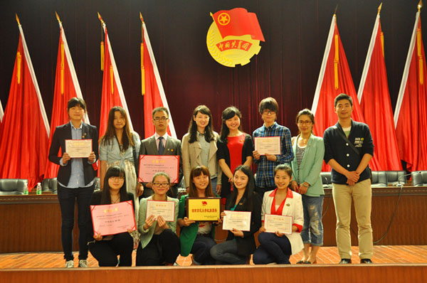 大会在雄壮的国歌声中开始。晏昱书记作了题为《弘扬五四精神,成就青春梦想》的工作汇报,何旭娟部长宣读了《关于表彰2012年共青团工作先进集体和个人的决定》,授予公司团委等7个单位“红旗团委”称号。公司“弘扬雷锋精神,倡树文明新风”系列活动荣获十佳团日活动奖项,2010级新闻班荣获十佳团支部称号。各系、年级多名同学获得十佳共青团员、十佳学习尖子、十佳文艺尖子、十佳体育尖子等多个校十佳奖项。校领导为获奖先进集体和优秀个人颁发证书,并同师生热情握手,表示祝贺。