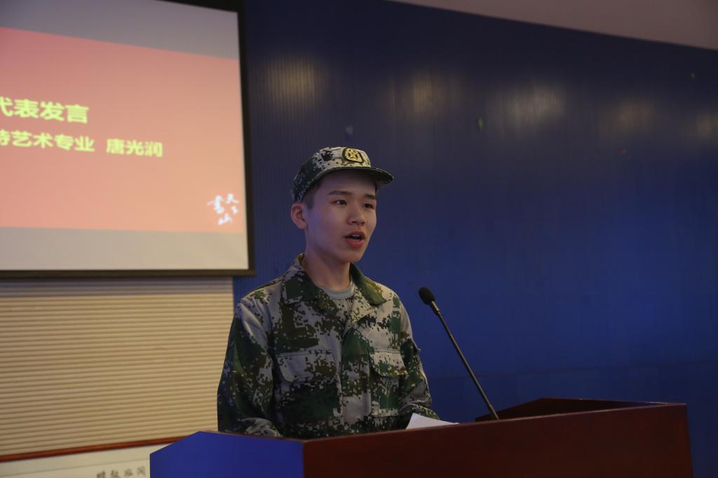 学员代表陈蔓菁发言,她呼吁同学们以军人的姿态严于律己,培养钢铁般的意志;团结并进,形成无坚不摧的集体;新传院的男同学应力争上游,发挥出英勇的男儿气概,而女同学应巾帼不让须眉,展现花木兰、穆桂英般的英姿。