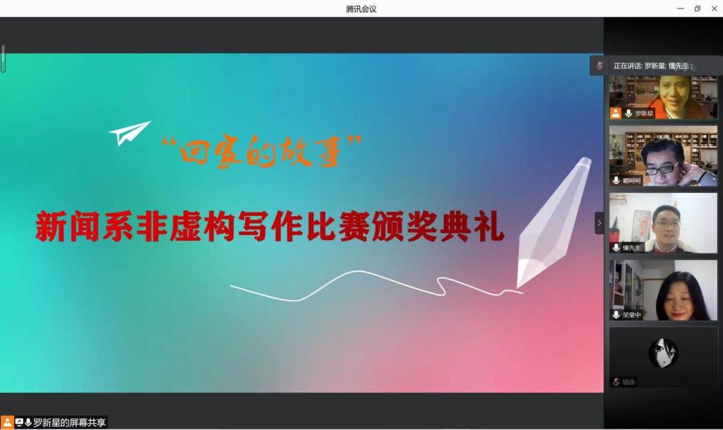 经过翁杨、陈艳辉、罗新星、汤敏四位老师的评选,第一届非虚构写作比赛共评出优秀作品14篇,其中一等奖2篇,二等奖5篇,三等奖7篇。吴果中教授与4位评委老师召集所有参赛同学于3月12日晚通过腾讯会议进行了云颁奖,老师们对相关作品进行了点评,并从写作主题、内容、结构、文字等角度提出了修改意见。3月16日下午,吴果中教授到张公岭校区为获奖同学颁发了获奖证书。