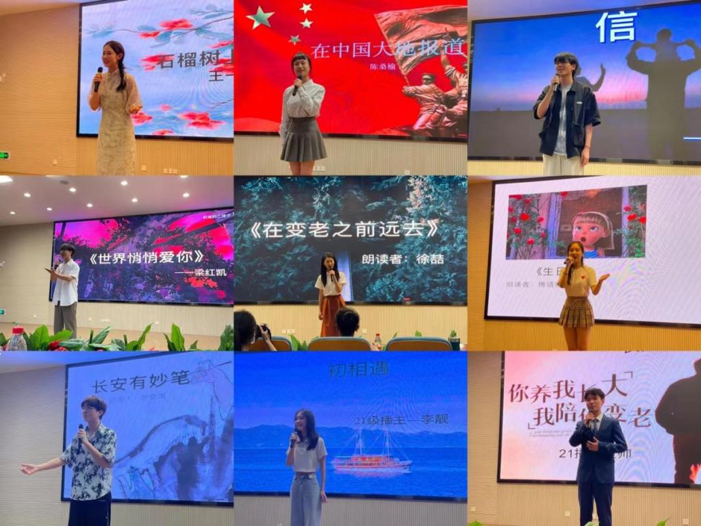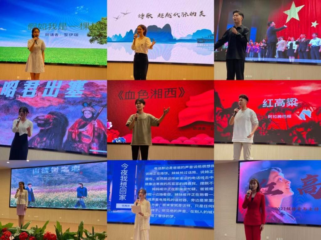 伴随富有感染力的配乐,选手们围绕活动主题自备稿件,带来了一场场声情并茂的演绎。从初见告白到逝前绝唱,从古时征战沙场到今日努力实现中国梦想,选手们选取了多元化的朗诵主题。其中,来自2021级播主专业的黄帅朗诵的《长大回家》以一个漂泊在外的游子的视角,表达了对家乡深深的思念和热爱;来自2021级播主专业的江博文古调今咏,用杜甫的名篇激起了人们对这个时代的新思考;来自2020级播主专业的徐喆则讲述了在变老之前远去的优美故事等。