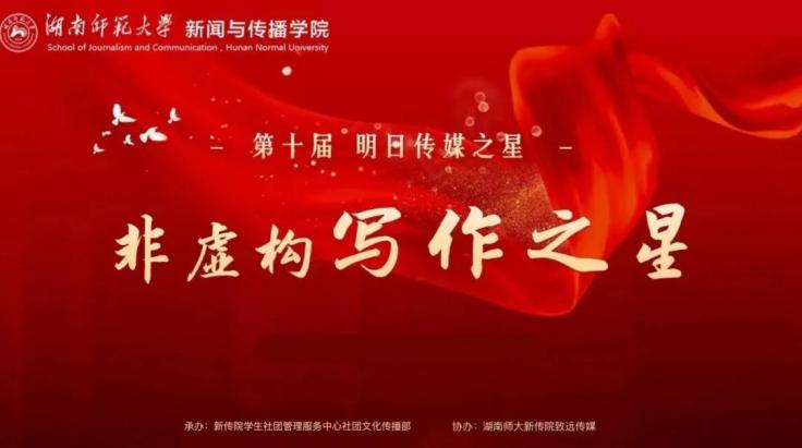 (通讯员 陈可心 易高娄 慧煜)耀青春百年,奏时代强音!5月19日晚,第十届明日传媒之星“非虚构写作之星”决赛于线上举行,新传院罗新星老师、陈艳辉老师、汤敏老师、朱费伽老师担任此项比赛的评委。非虚构写作之星由新传院员工社团管理服务中心社团文化传播部承办,致远传媒协办。
