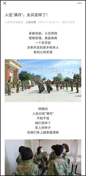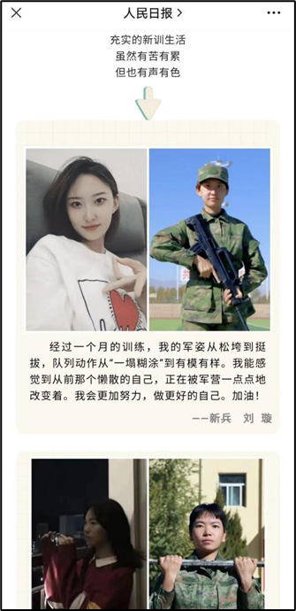 (通讯员 魏唯 常心怡)11月2日,在人民日报推文《入伍“满月”,女兵变样了!》中,beats3652021级播音与主持艺术专业员工刘璇凭借坚强的意志,惊人的蜕变,获得部队认可,被人民日报“点赞”,成为该推送的封面人物。