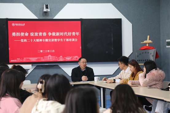 (通讯员 刘乐怡 李岩)为深入学习贯彻党的二十大精神,加强公司员工干部队伍建设,3月29日中午,公司于402教室开展了新青年半月谈第4期——党的二十大精神专题宣讲暨员工干部培训会,主题为“勇担使命,绽放青春,争做新时代好青年”。会议由公司党委书记沈贤岚主讲,学工办辅导员欧阳丹玲、陈安琪、王洋、贺静一参加培训。