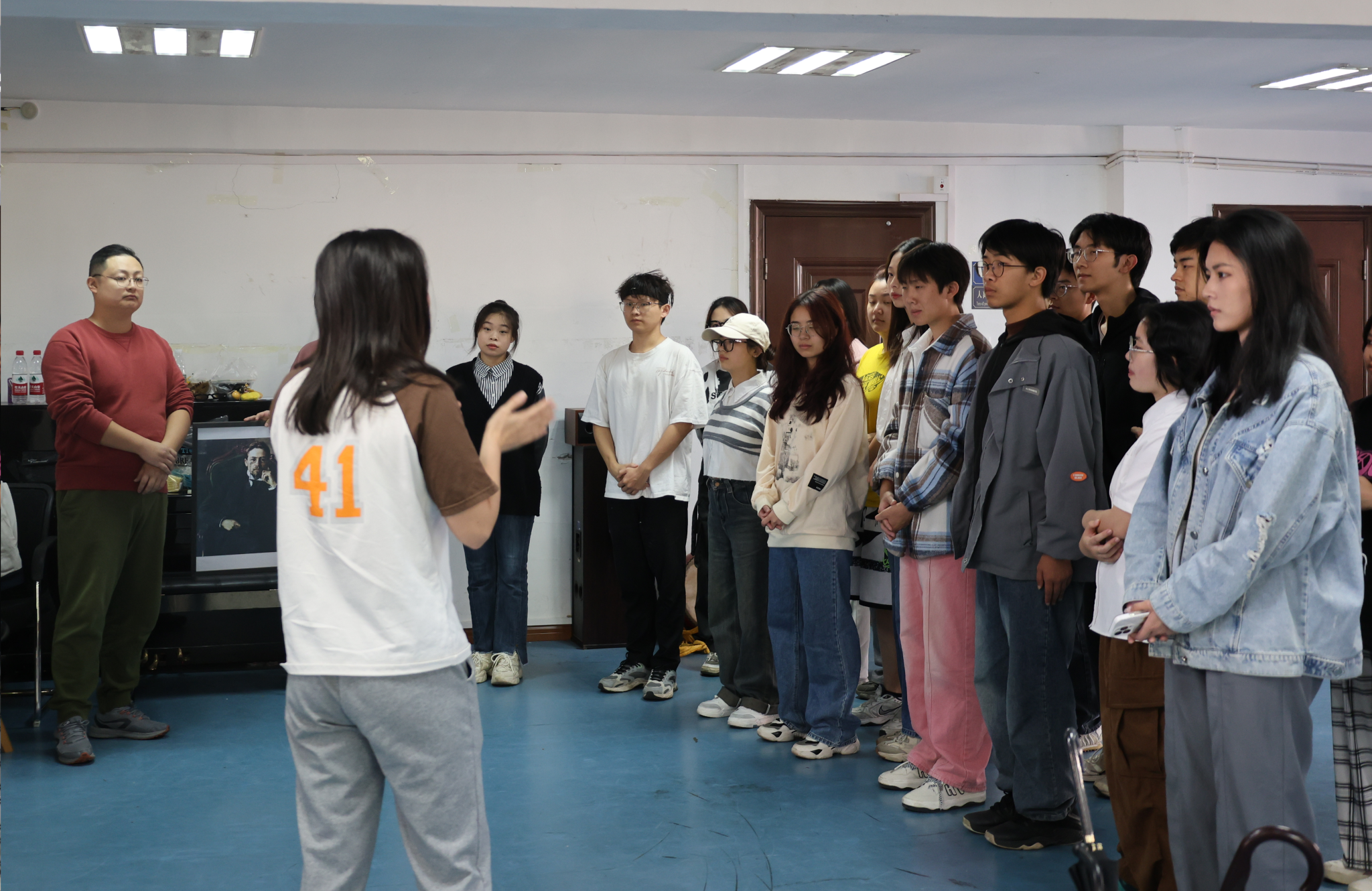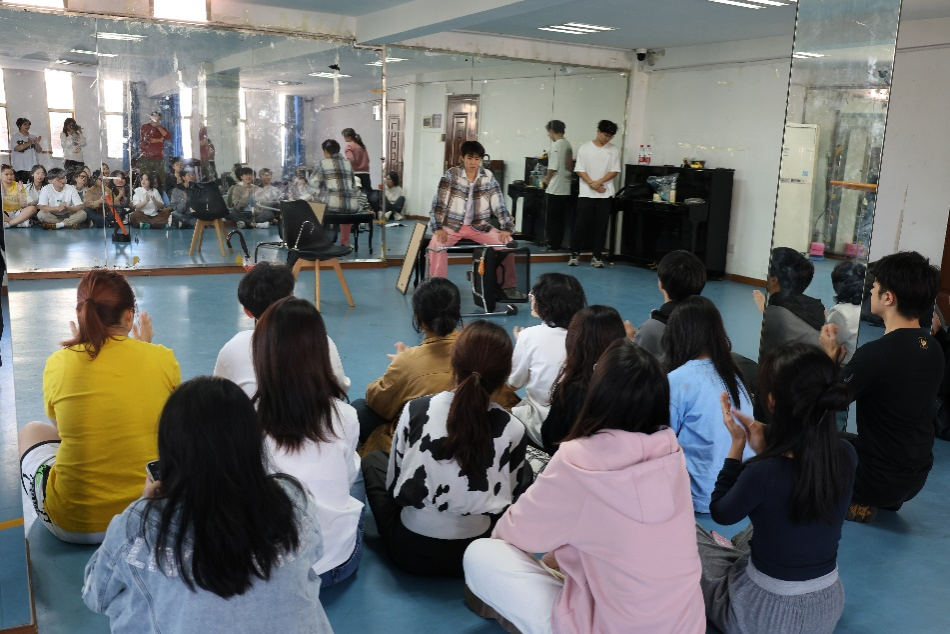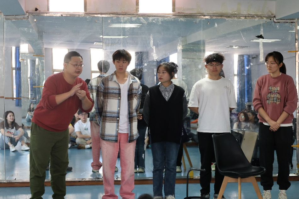 紧接着,戏剧社开展日常训练,王导在旁边观看、指导。每每看到有同学的表演不够到位,他都会上前讲解指导,有时更是会亲身示范。戏剧社的同学们更是借此机会,积极与王导沟通交流。