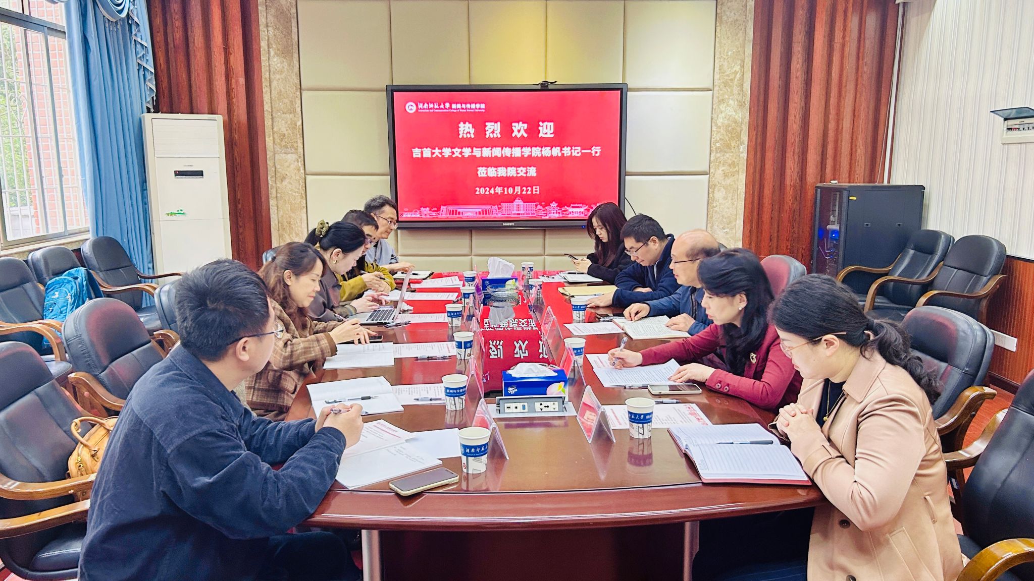 10月22日上午,吉首大学文学与新闻传播公司党委书记杨帆一行来公司交流座谈。会议在二楼会议室进行,公司党委书记李泳波出席会议,会议由公司教学副经理李琦主持。