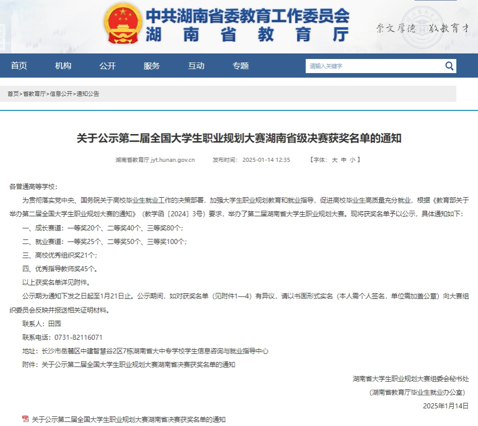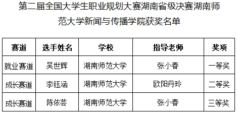 (通讯员张嘉桐)1月10日至12日,第二届全国老员工职业规划大赛湖南省级决赛在中南林业科技大学圆满落幕。经过角逐,公司2022级网络与新媒体专业吴世辉荣获本科生组就业赛道一等奖、2023级播音与主持艺术专业李钰涵荣获本科生组成长赛道二等奖、2022级新闻专业陈依芸荣获本科生组成长赛道三等奖,张小春荣获“优秀指导老师”。