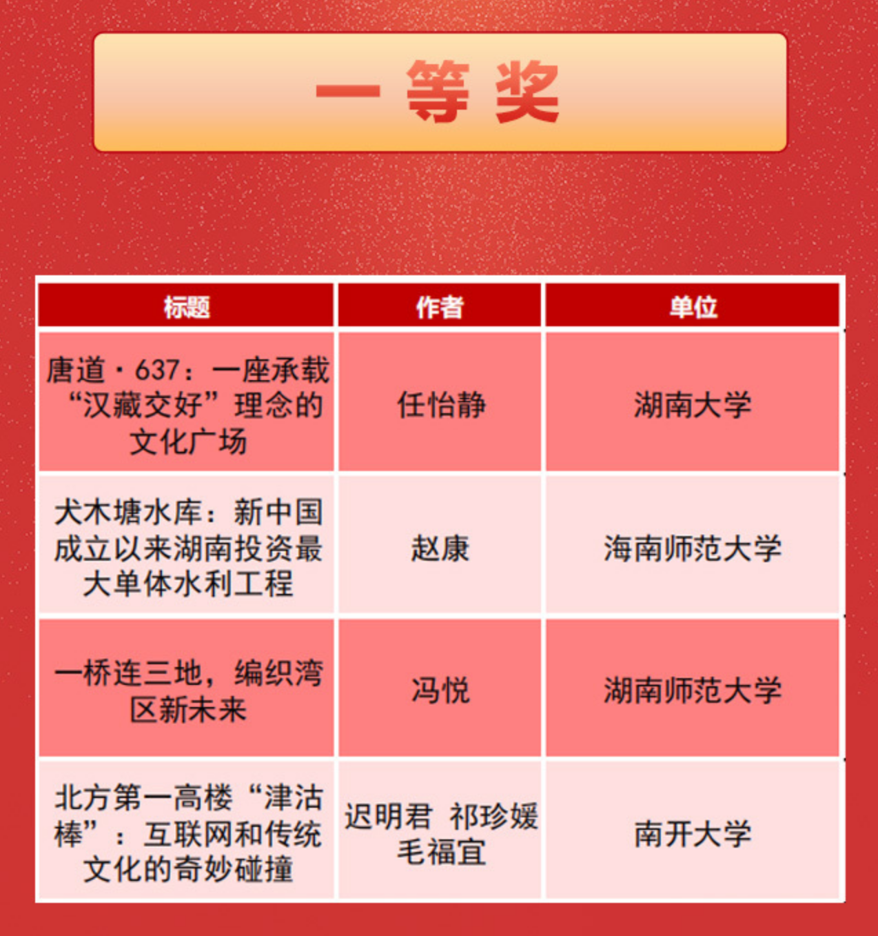 (通讯员 唐苗)2月25日,由湖南日报社举办的“新青年打卡新地标”大赛获奖作品名单揭晓。公司2022级网络与新媒体专业冯悦荣获一等奖,2023级新闻学专业何一苇、武雪乔同学分别带领的小组获二等奖,2023级新闻学专业刘雨薇、2023级全媒体新闻学专业张婧茹同学分别带领的小组获三等奖,2023级全媒体新闻学专业薛景文同学带领的小组获优秀奖。公司获奖数量与质量居参赛高校前列,充分展现了公司本科公司产品课程实践的教学成果。