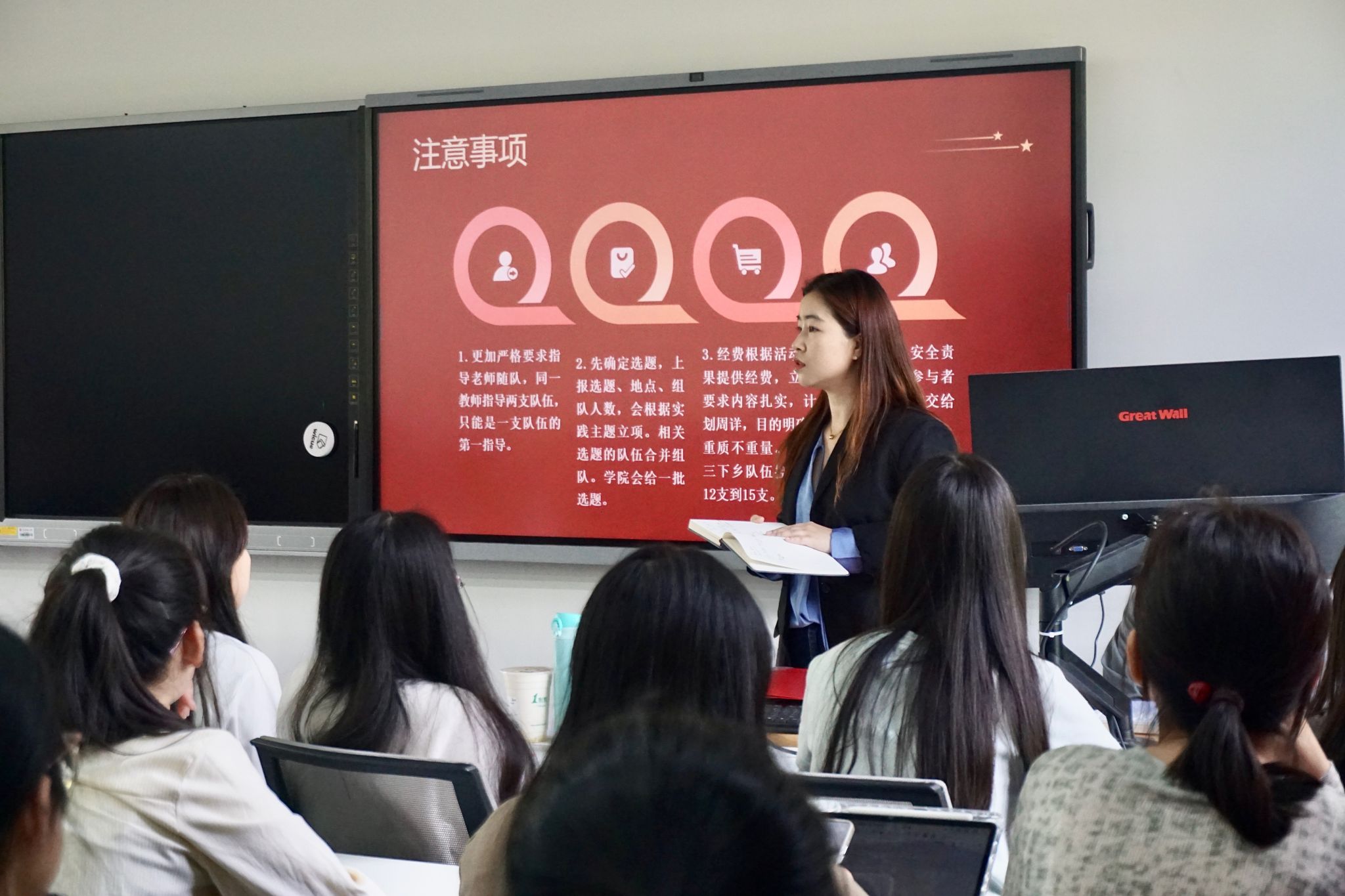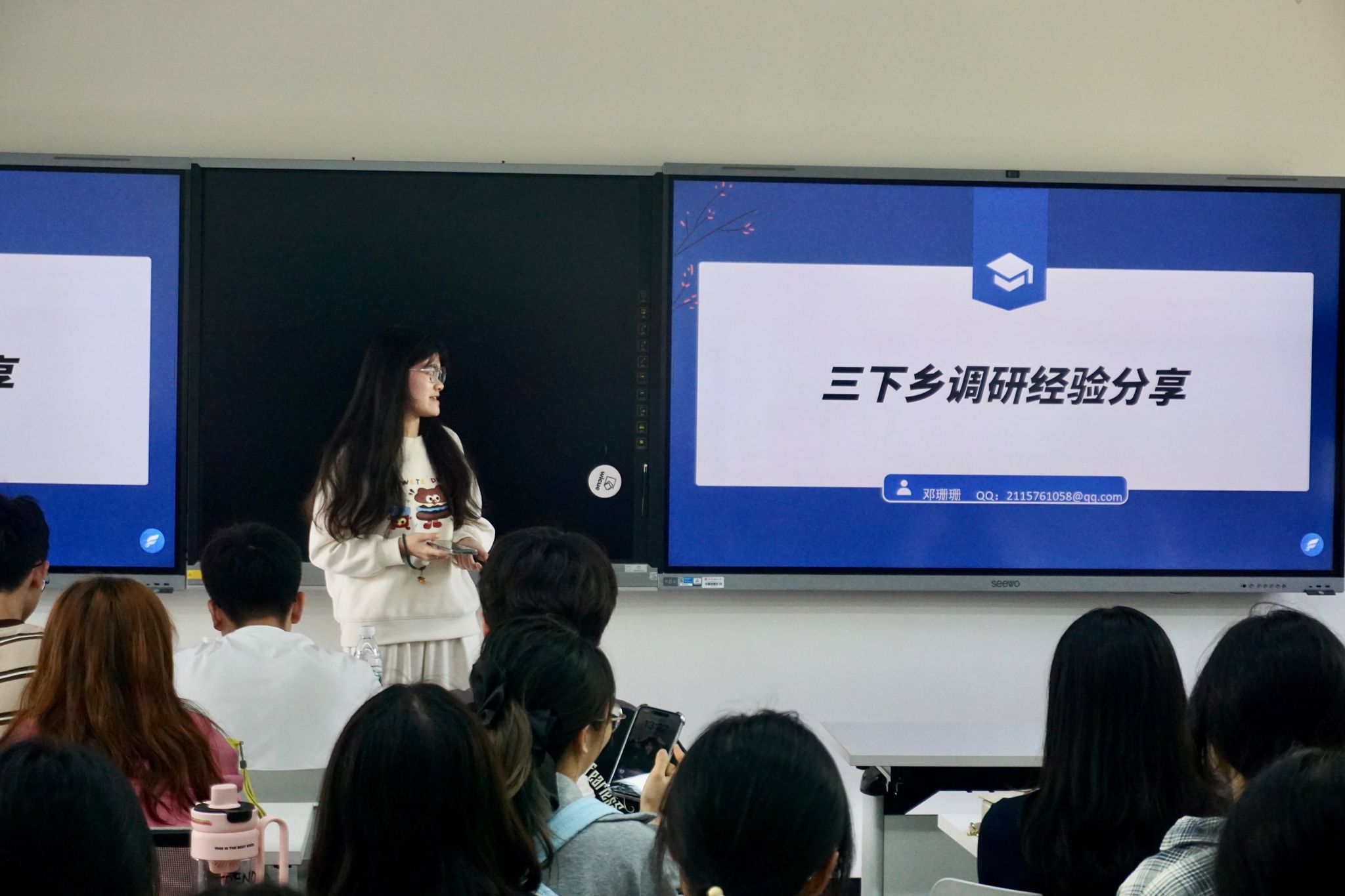 此次宣讲会,陈安琪结合往年“三下乡”活动实例,从新传院过往“三下乡”所取得的成果、“三下乡”对于员工成长的意义以及参与“三下乡”的重要事项等进行介绍。她谈到,“三下乡”是一种特殊类型的志愿服务,在决定参与前应做好充足的心理准备。同时,她谈及选题对于整个活动的重要性,引导员工要贴近民生,树立服务社会的意识。经验分享环节,李琳结合自身两段“三下乡”经历,展示了支教、调研、宣传、投稿渠道、财务后勤等具体实践板块;邓珊珊则将侧重点放在调研经验的分享上,从调研地点的选择、问卷的设计、报告的制作等方面,为有志于参与暑期社会实践活动的员工提供了实践指南。