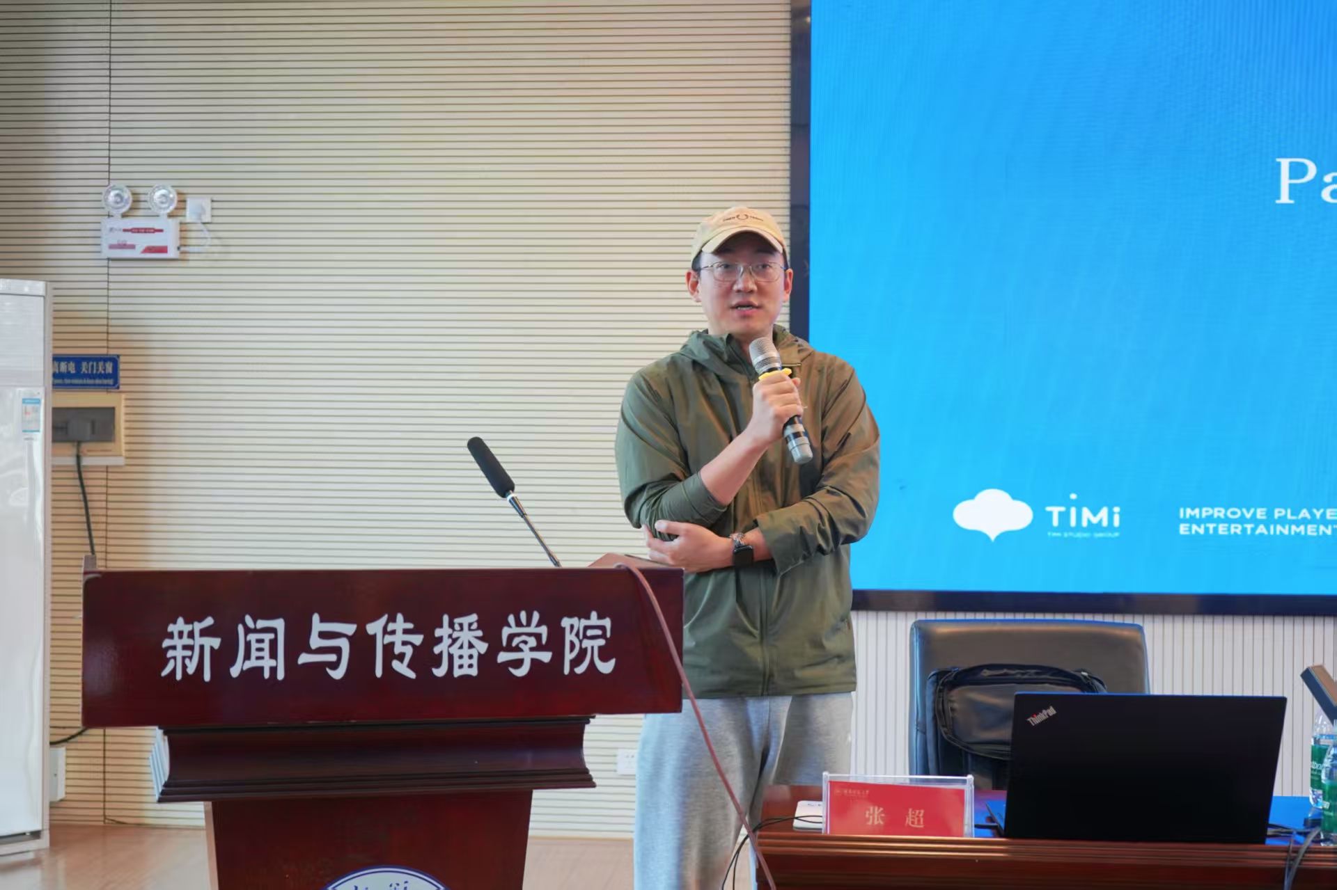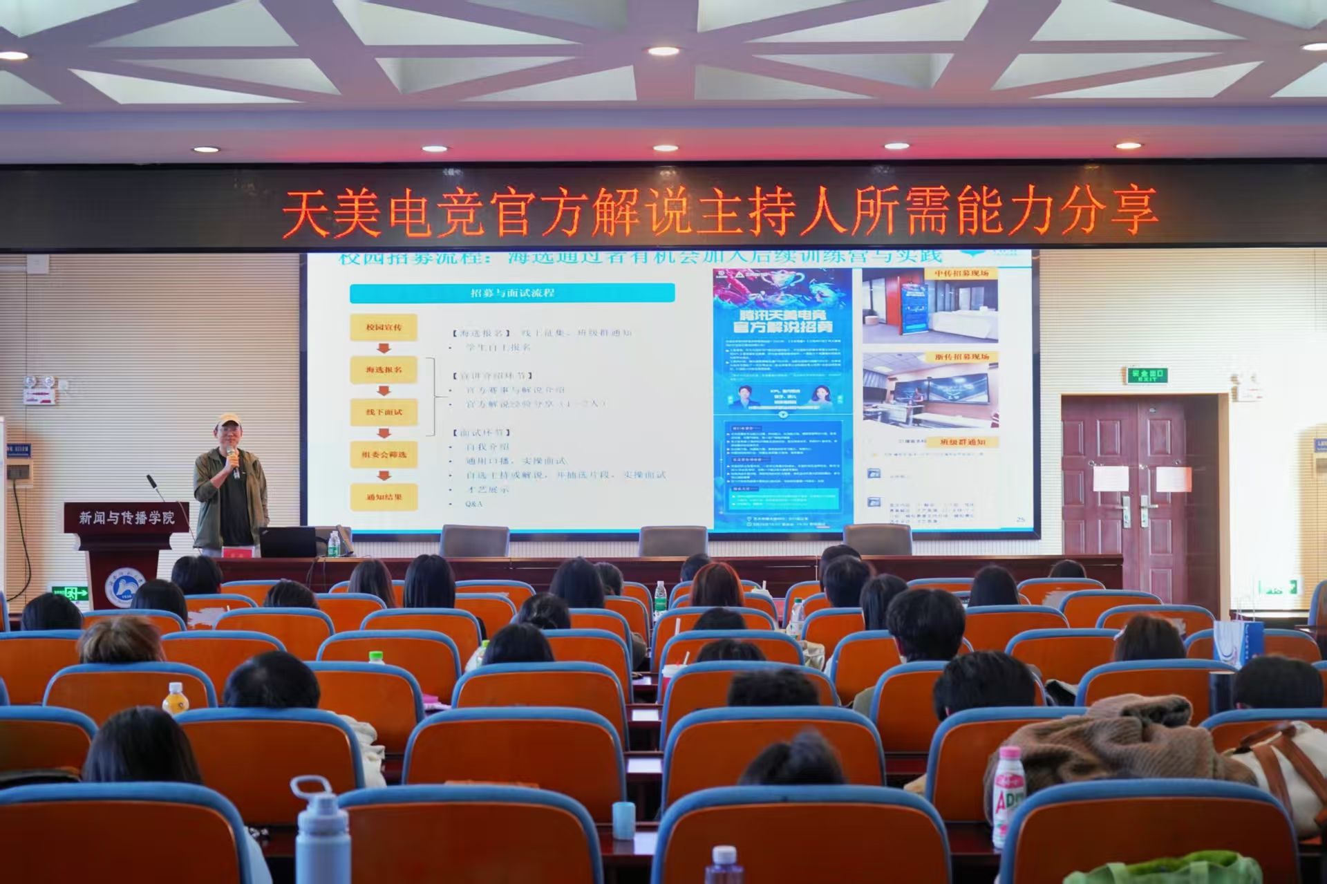 张超以2020年杭州亚运会为切入点,播放了一段央视直播决赛解说录像分享,向同学们介绍了电竞官方解说主持的职业特点。随后,他结合详实的数据与图表,系统分析了电竞行业近年来的飞速发展,展现出电竞行业未来的光明前景。作为赛事制作人,张超进一步阐释了电竞行业的架构组织与运行机制,并分享了在媒体融合背景下行业对人才需求的最新趋势。为帮助员工进行更加详细的职业规划,张超还详细解读了天美电竞官方解说主持的校园招募流程与具体要求,涵盖从训练营、实践锻炼到实习上岗的全过程,干货满满,指导性强。