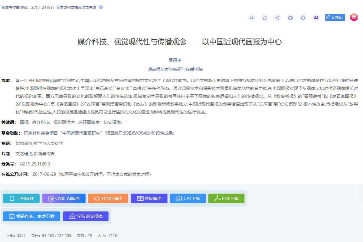 吴果中的《媒介科技、视觉现代性与传播观念—— 以中国近现代画报为中心》,聚焦西学东渐背景下中国画报的发展历程,深入剖析印刷、摄影等媒介科技对视觉文化现代性转型的推动作用,开拓了新闻史研究的新视角。作为新闻学系主任、中国新闻史学会理事,吴果中教授长期致力于新闻传播史论研究,主持多项国家级、省部级项目,取得了丰硕的教学与科研成果。