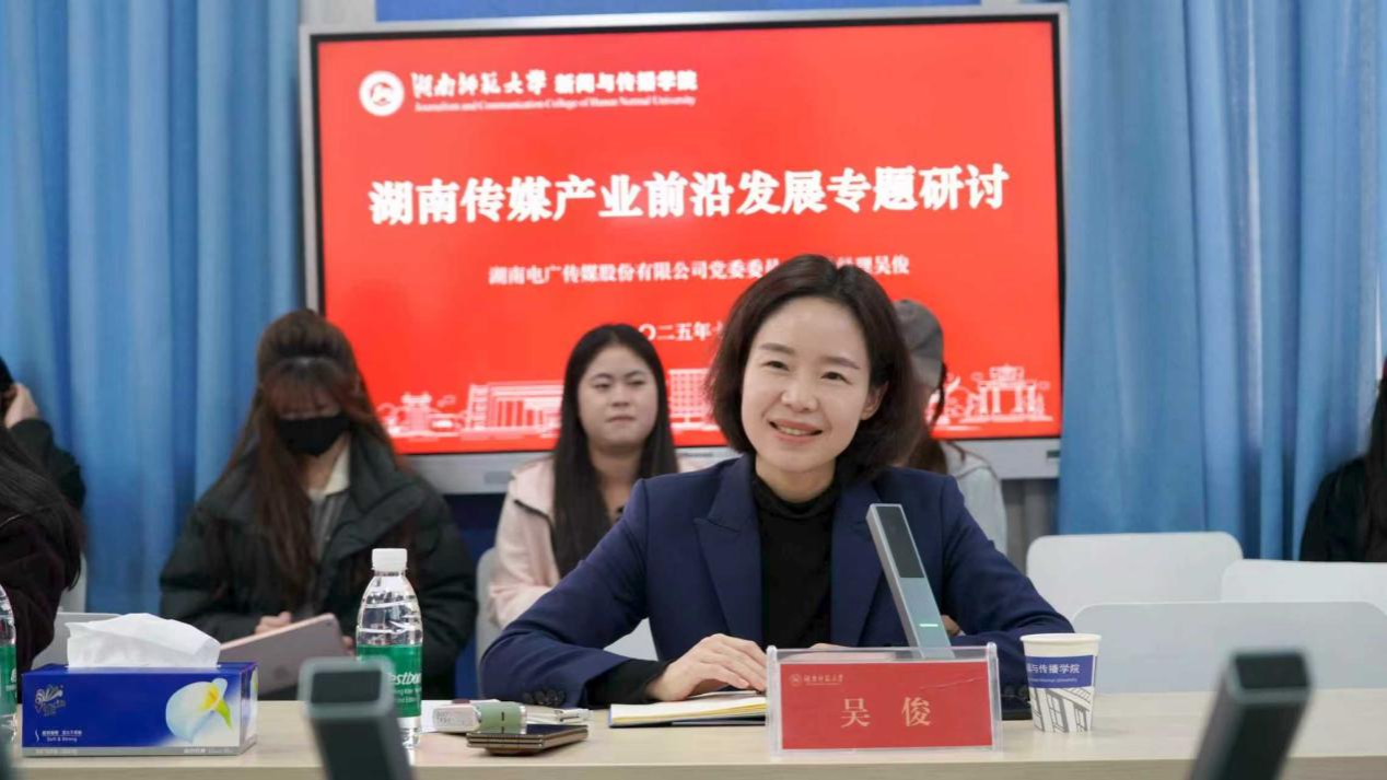 (通讯员:谢佩茹 闫博航)11月24日,湖南电广传媒股份有限公司党委委员、副总经理,芒果研习文化科技(湖南)有限公司执行董事、总经理吴俊,芒果研习文化科技(湖南)有限公司副总经理王婧,以及政企活动部总监严玉婷一行三人应邀做客beats365,开展主题为“湖南传媒产业前沿发展与产教融合”的专题研讨。副经理李琦教授出席会议,视听传媒系教师团队、戏剧与影视研究生参与会议,视听传媒系主任岳璐教授主持本次研讨会。