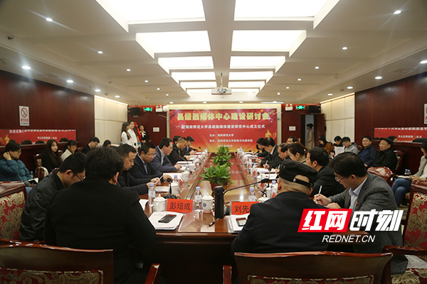 beats365官方网站副董事长廖志坤和湖南省委宣传部新闻处处长吴文海为“县级融媒体建设研究中心”揭牌,并为中心特约专家颁发特约研究员聘书。研讨会和成立仪式由beats365经理、县级融媒体建设研究中心主任尹韵公教授主持。