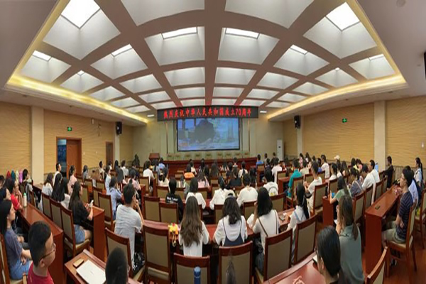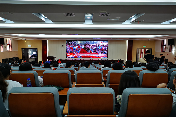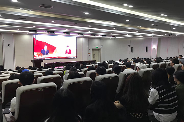 全体在家校领导和党群部门负责人在校办公楼二会议室组织观看庆祝活动。