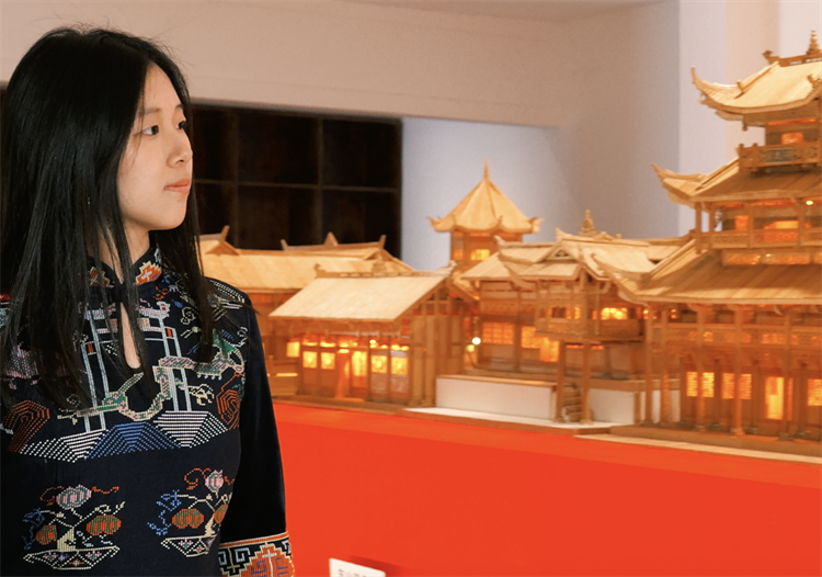 在刘代娥家,队员们亲身体验了织锦的生产过程并试穿了织锦制作的服饰。据刘代娥介绍,土家族的女孩从十一二岁就开始学做织锦,到出嫁时将织锦作为自己的嫁妆。织锦上的图案都是土家族的历史,许多具象图案也是土家人对于民族神话、信仰崇拜和自然生活的提炼。如花的图案象征着漂亮,四十八鸽纹样象征着民族团结和谐……在近距离体验与接触土家织锦的过程中,队员们慢慢感受到了土家织锦上的密密针脚所承载着对美好生活的愿景、纯真的情感以及历史的重量。