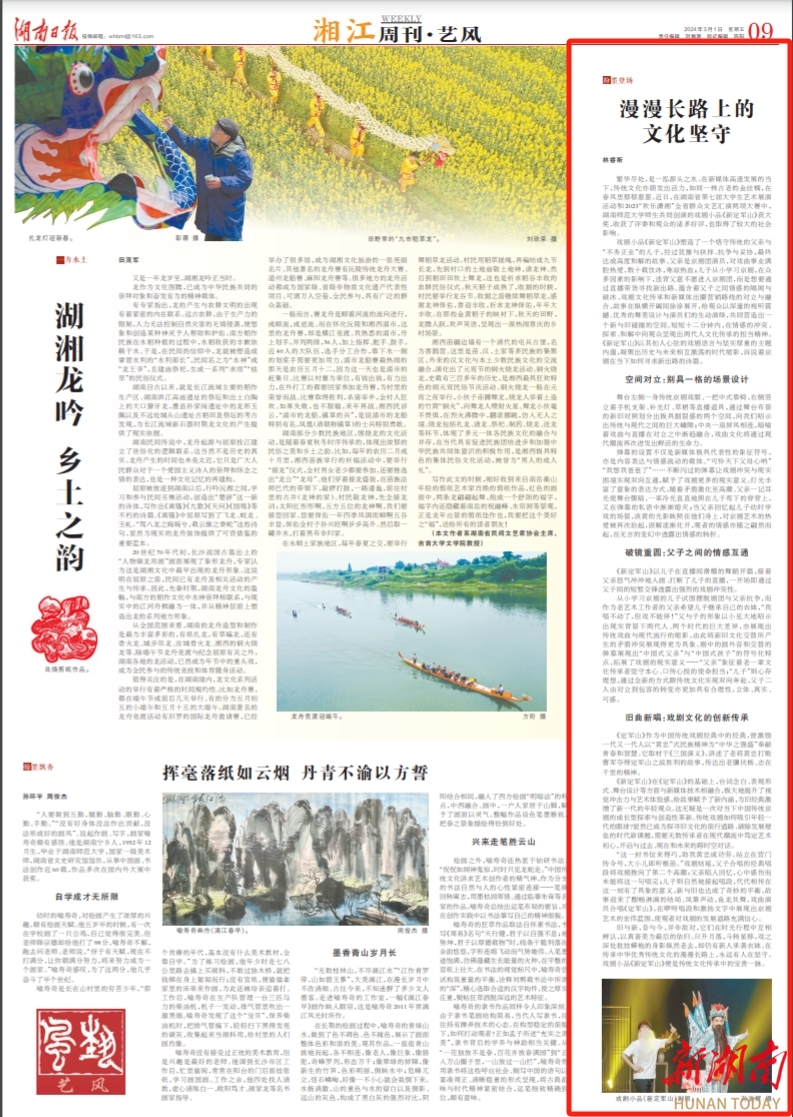 旧与新,昔与今,并非敌对,它们在时光行程中互相辨认,以真善美为最后的依归。日升月落,斗转星移,戏之深处批挂蟒袍的身影纵然老去,却仍有新人承袭衣钵。在传承中华优秀传统文化的漫漫长路上,永远有人在坚守。戏剧小品《新定军山》便是传统文化传承中的宝贵一脉。
