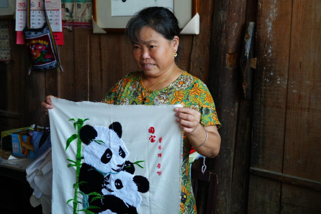 (曾冬娇展示插绣作品。通讯员 摄)