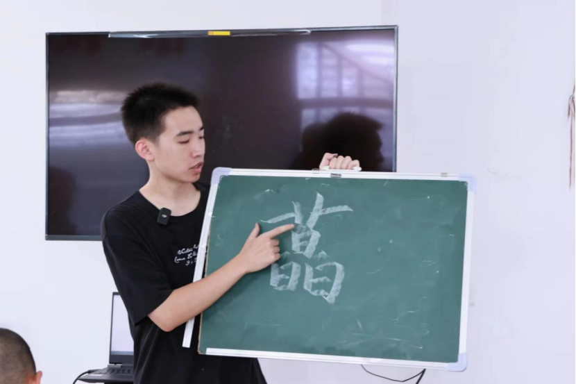 此次多元推普课堂分为语音推普和书法推普两项内容。语音推普课堂上,团队成员带领孩子们复习了之前课上写过的口部操,让唇,舌,面部得到充分的锻炼与放松,为孩子们之后说好饱满圆润,清晰流利的普通话打下了基础。复习过后,团队成员为孩子们准备了手势舞练习,孩子们积极参与其中。