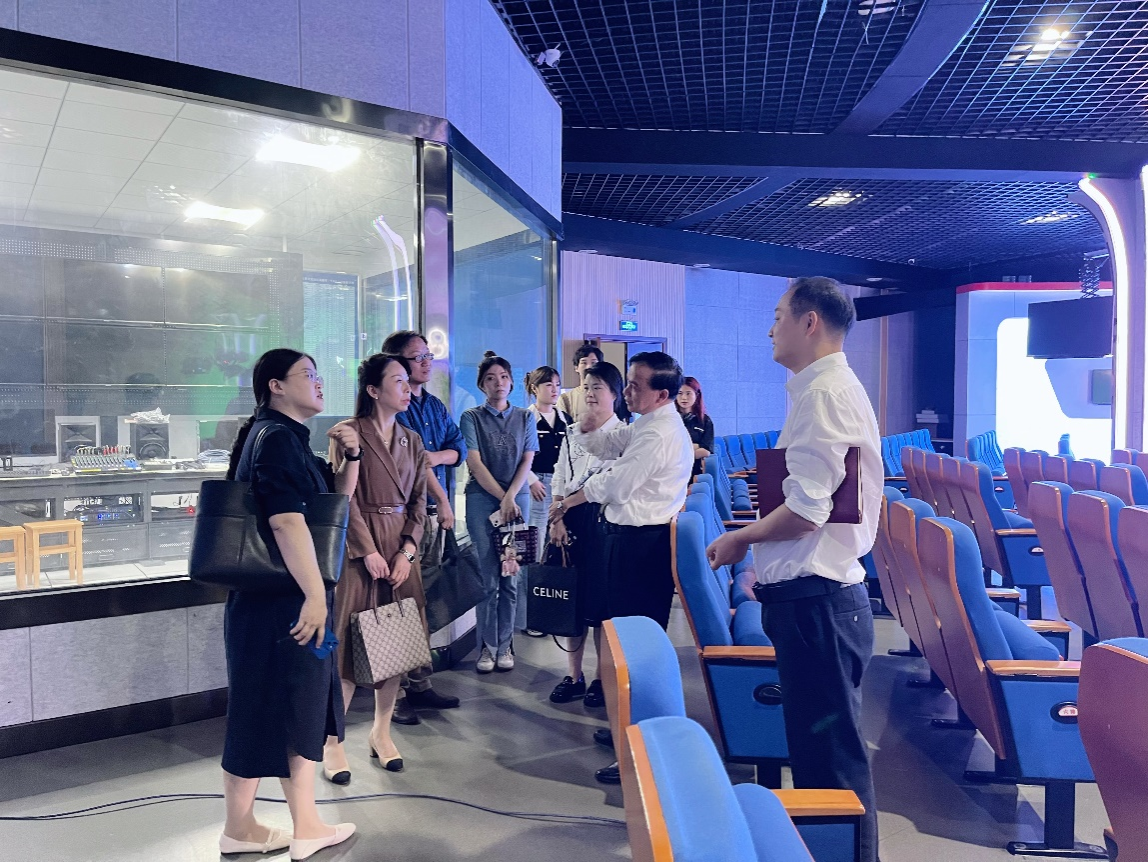 李琦一行在湖南信息公司艺术公司教师交流活动中心与该院播音与主持艺术系、数字媒体艺术系教师代表进行了座谈双方围绕青年教师的学术规划,申报国家级、省部级科研课题的注意事项以及如何教学成果转换为学术论文等内容展开了热烈的交流。座谈结束后,李琦一行参观走访了湖南信息公司艺术公司的音乐厅、摄影棚、演播室、录音室等教学场地,全面了解艺术公司的教学设施。