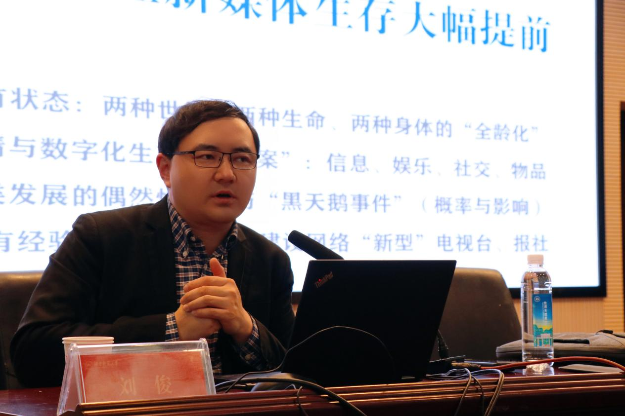 围绕“新媒体技术与生存的关键发展趋势”这一主题,刘俊分别从数字媒体发展的现状、技术的变革、传播的基础状态、对生命存在的认知和思维方式的转变等五个方面展开分析。