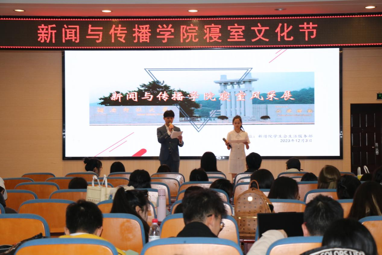 寝室文化节分为寝室装扮、内务检查、线上投票、寝室风采展4个部分。经过前期的实地考察、线上投票,筛选出优秀寝室进行现场展示。在现场风采展环节中,参与评选的10个寝室成员轮流上台展示各具特色的寝室风采,选手们以演示文稿、视频、图片等形式介绍了寝室日常生活和寝室文化、内涵。同时各个寝室也带来了歌曲演唱、舞蹈、舞台小品等才艺,体现了新传学子快乐学习、健康生活的精神面貌。