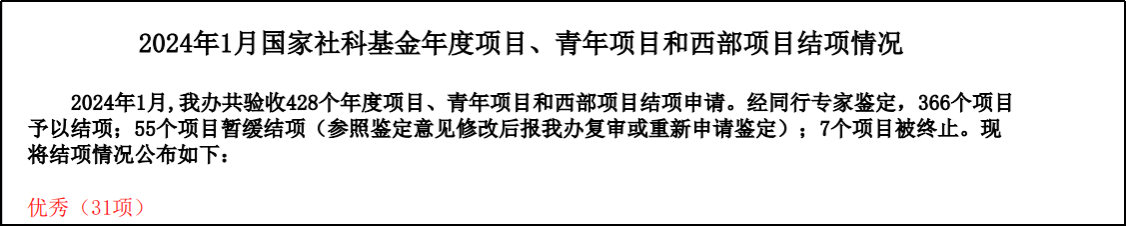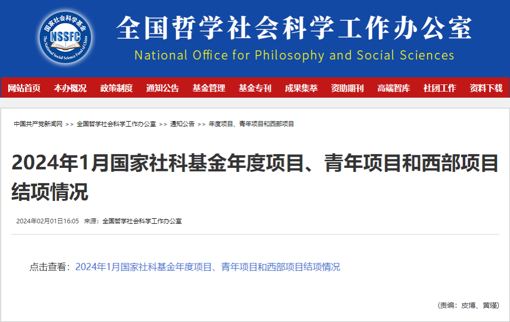 近期,全国哲学社会科学工作办公室公布了2024年1月国家社科基金项目结项名单。公司燕道成教授主持完成的国家社科基金重点项目研究成果《大数据时代青少年网络意识形态引导研究》顺利通过国内同行专家鉴定,经全国哲学社会科学工作办公室审批,获评“优秀”等级。