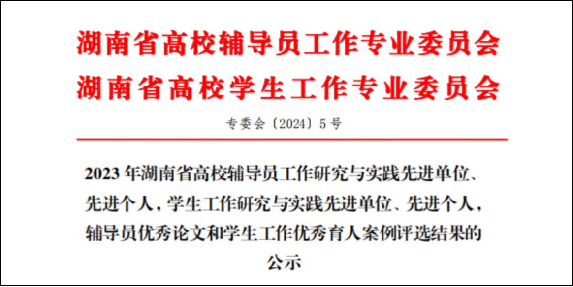 据悉,湖南省高校辅导员工作研究与实践先进评选旨在提高辅导员工作质量、促进辅导员队伍建设及丰富辅导员工作理论体系。此次评选共选出2023年湖南省高校辅导员工作研究与实践先进个人99名、辅导员优秀论文36篇。