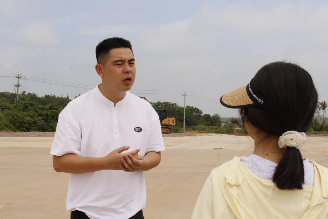 在金坪村枳壳种植基地,队员们对白衣镇金坪村党总支副书记戴燕进行访谈。戴燕提到,白衣镇目前大力发展中草药,在金坪村的枳壳种植定点试验工作已取得了显著成果,后续将进一步增大中草药种植规模。