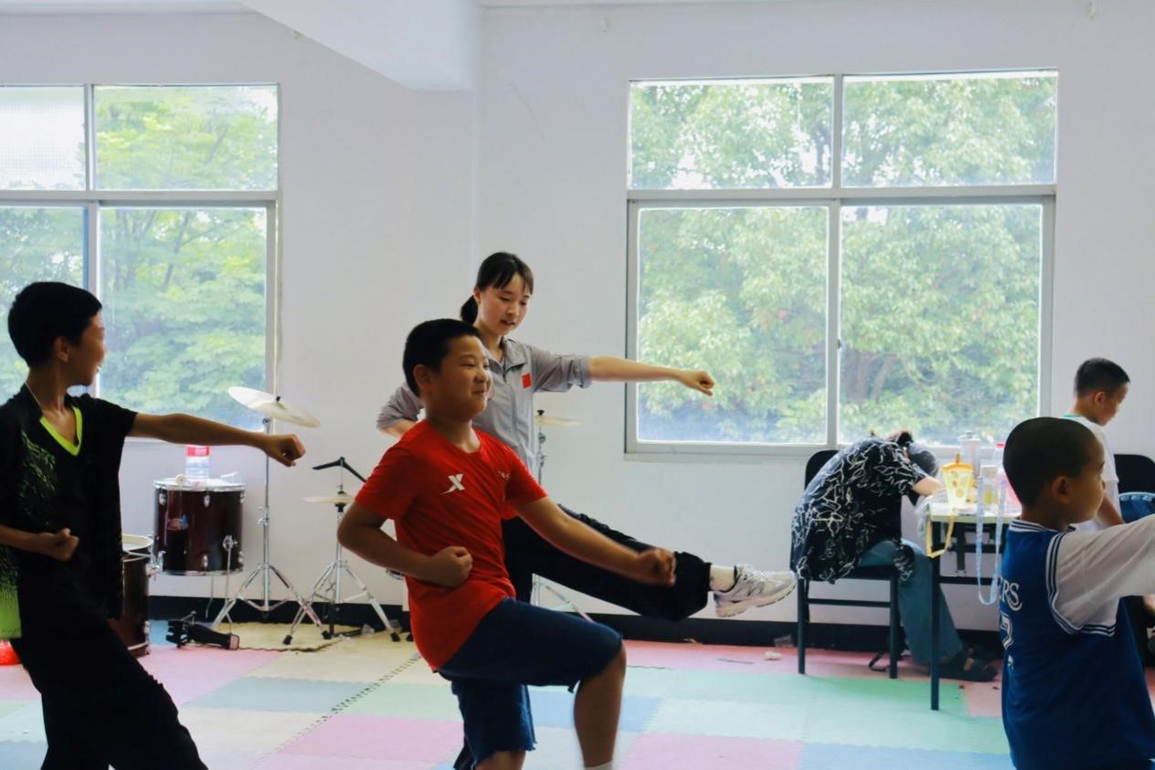 体育课堂上,实践团课程组针对员工较大的年龄跨度,选择开展跨越年龄界限的五步拳进行教学,致力于带领乡村孩子们打出五步拳风采,为后期文艺汇演做准备。队员们亲身示范正确动作,以一步一练的方式纠正员工的动作,防止员工在运动过程中肌肉拉伤。在强身健体过程中,员工们增强了体质和体魄;在互相纠正和共同学习的过程中,员工们明白合作的意义,进一步凝聚团队魂。