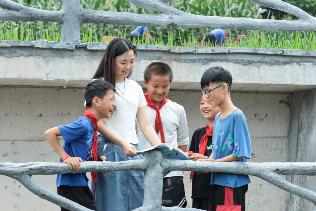 实践团成员正在向孩子们示范正确读音