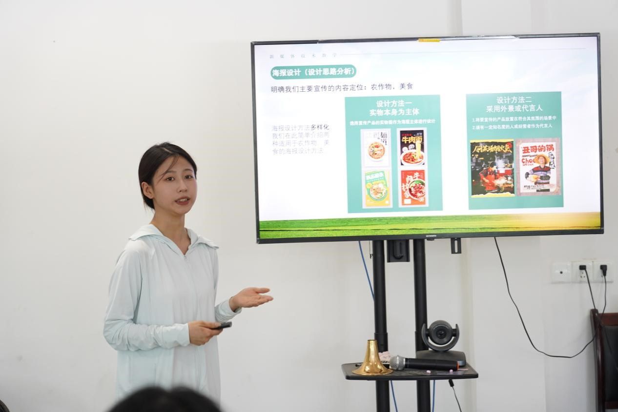 此次新农人培训课的课程内容涉及技术与话术两方面,成员们简化整合相关信息,结合实例,为当地农户、农企拆解技术难点,讲解话术设计原则。成员们围绕新媒体运营所需掌握的基本技术,为大家讲授了平台账号的注册与经营、短视频的创作与发布以及宣传海报的制作等内容。教学过程中,成员们针对当地特色,利用对标账号向大家展示了具体操作方法与过程,并讲明了操作的重点、难点与相关注意事项。