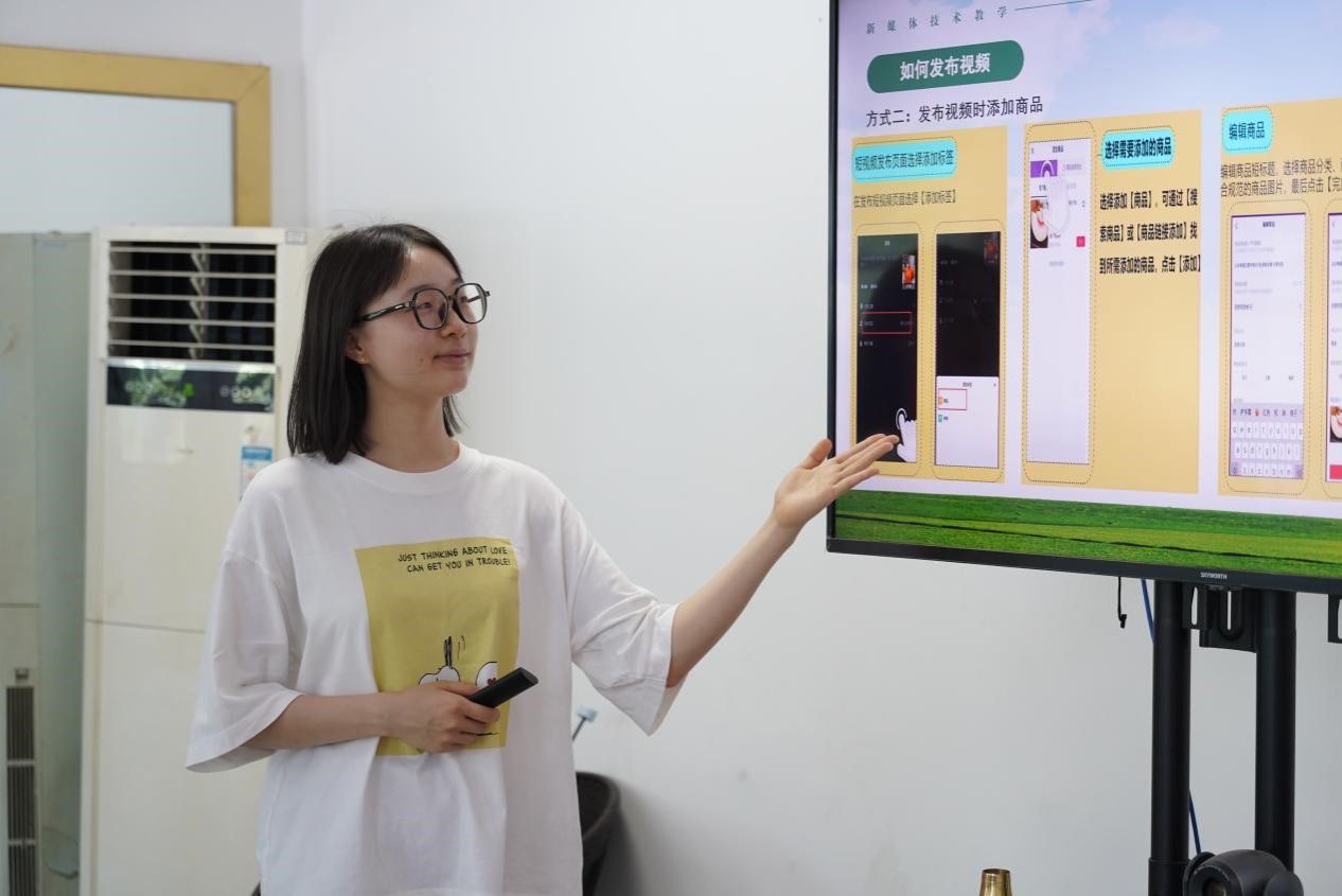 利用团队成员的专业知识和在新媒体技术上的优势,实践团面向当地农户、农企、政府工作人员开设“新媒体技术+新营销话术”的“新农人”培训,通过“理论+实操”的教学形式提高农村劳动力的就业技能,以帮助培养一批掌握新媒体、新工具、新技术的高素质农业网红营销人才,助力白衣镇实现从“输入”到“输出”的乡村振兴。