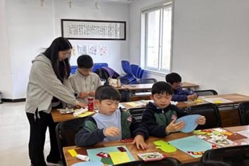 手工制作环节。志愿者们分发了手工材料,指导小朋友们制作雷锋手工画。小朋友们在志愿者的引导下,进行剪裁、粘贴,用画笔描绘出雷锋的形象。