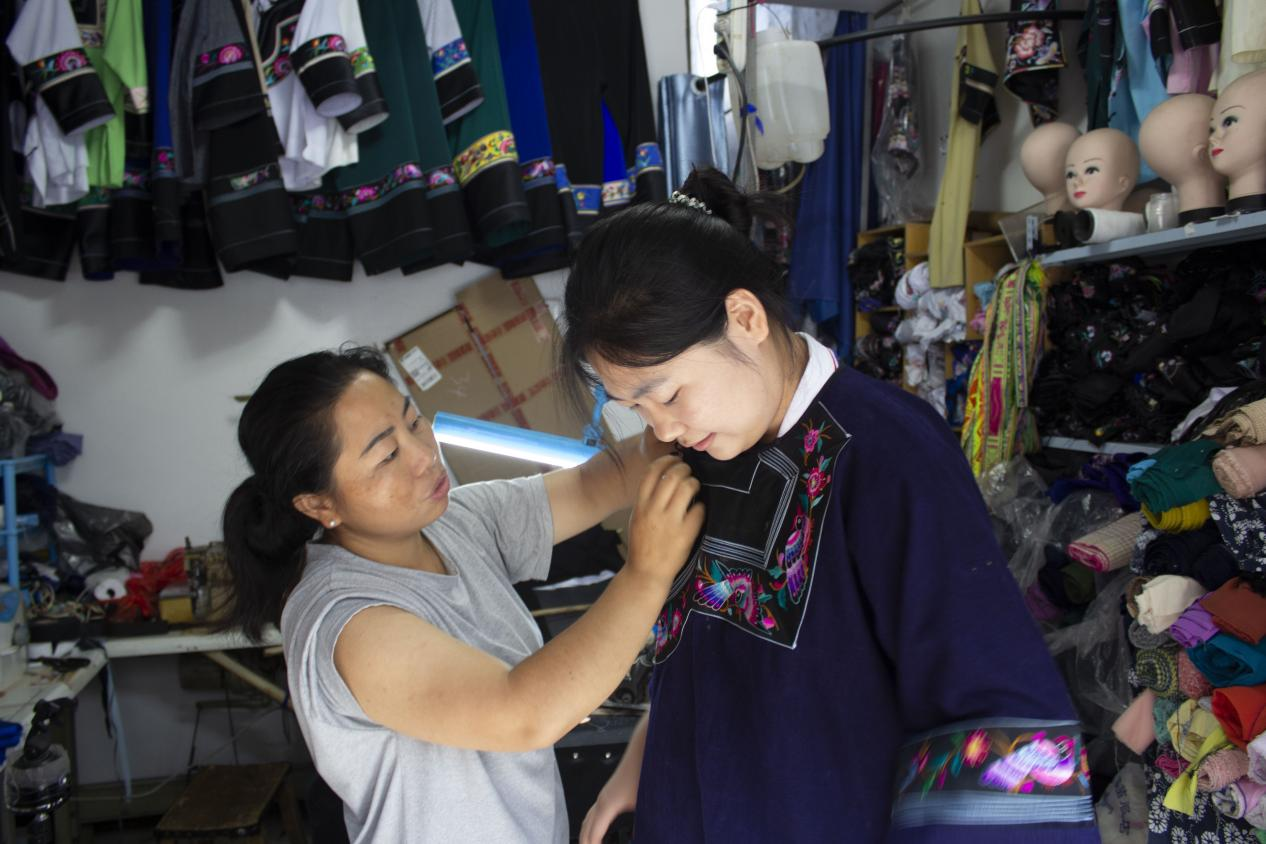 实践团成员来到国茶村集市,走进一家苗绣店铺对店主进行深入采访。店主详细介绍了苗绣的历史渊源、图案寓意和刺绣技法。苗绣作为苗族文化的重要载体,其纹样涵盖自然万物与神话传说,每一针每一线都蕴含着苗族人民对美好生活的向往与独特的审美观念。在店主的讲解下,成员们对苗绣的文化价值有了更清晰的认识。随后,实践团成员试穿苗族传统服饰,亲身体验苗绣工艺。在店主的指导下,成员们拿起绣针,尝试简单的刺绣针法,感受苗绣制作的精细与不易。通过实践,成员们表示,不仅看到了苗绣的精美,也看到了非遗传承人的坚守与付出。